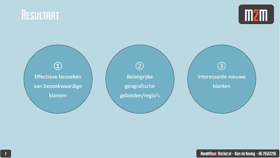 - Efficiëntie in de organisatie: Bespaar tijd en middelen door het juiste aantal mensen op de juiste klanten in de juiste regio’s in te zetten. Gericht op een duidelijke doelstelling van het aantal af te leggen bezoeken.