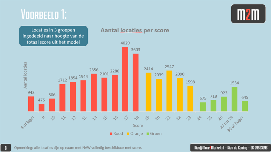 Onderstaand is het resultaat van het verdelen van bijna 40.000 locaties in rood, oranje en groen, waarbij groen de meest aantrekkelijke locaties zijn. De totaal score staat op de x-as en geeft aan hoe aantrekkelijk een locatie is. De y-as telt het totaal aantal locaties met een bepaalde score.