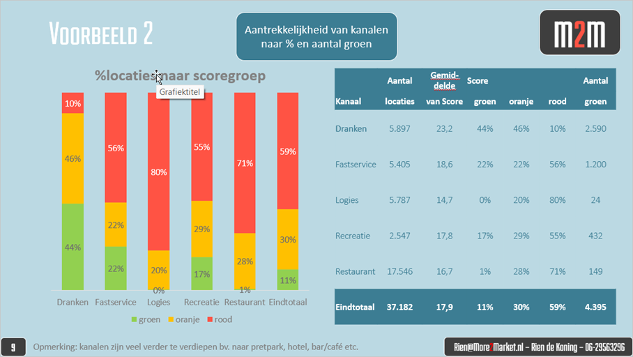 Een stap verder is dezelfde verdeling maar dan naar kanalen, waarbij dranken veruit het hoogste scoort op groen met 44%, gevolgd door fastservice met 22%. Wat resulteert in 2.590 interessante drankenlocaties en 1.200 fastservice locaties.