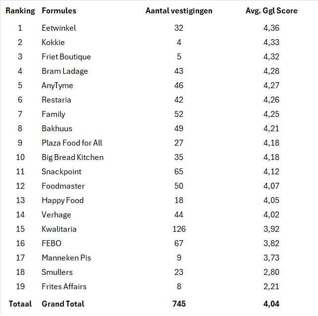 Vestigingen zijn in september 2025 geïdentificeerd vanuit de formulewebsites en gekoppeld aan Google en Thuisbezorgd waar mogelijk; verzamelde variabelen: Google-score, aantal Google-reviews en Thuisbezorgd-reviews.
