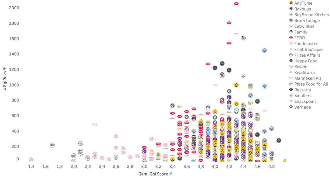 - N.B. In de grafiek vallen Smullers en FritesAffairs wegens een lage score buiten beeld en Manneken Pis wegens een uitzonderlijk hoog aantal reviews; alle data staan wel in de tabel gesorteerd op Google-score.